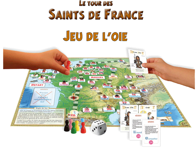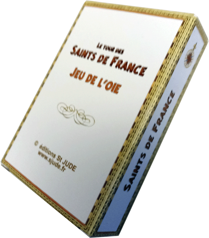 Jeu de l'oie et quiz des saints de notre pays. 50 cartes, 4 pions et 1 dé.